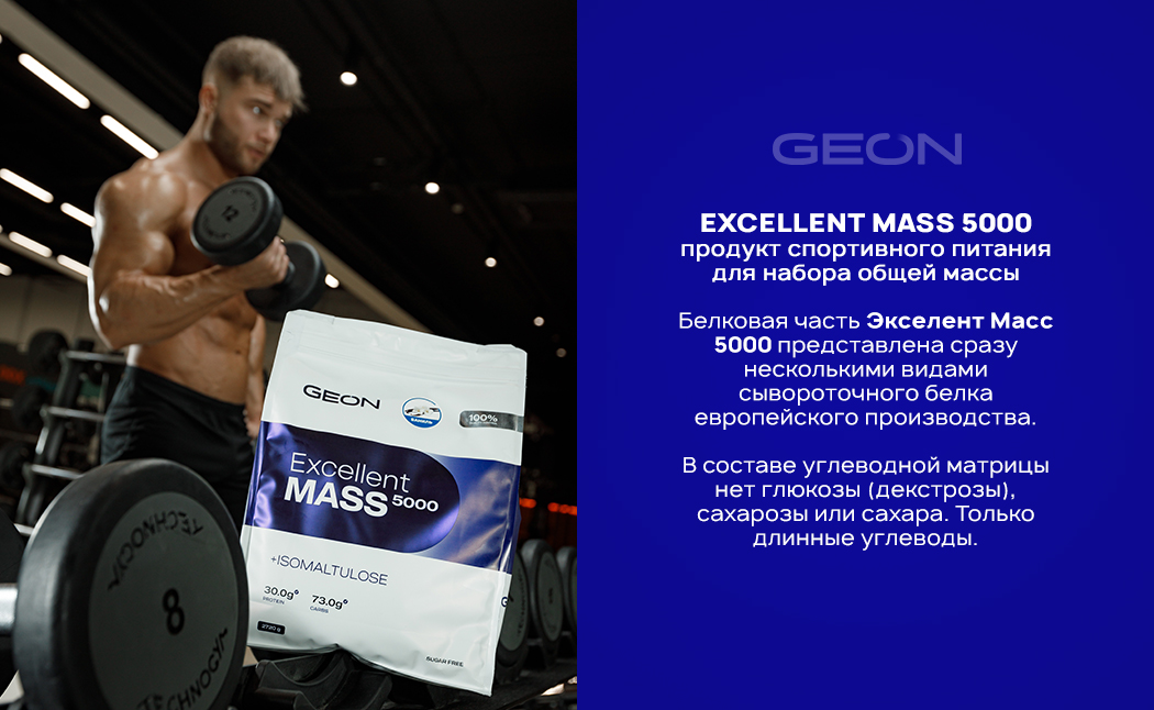 Поэтому хотелось бы обсудить более современные варианты гейнеров, в которых хороший состав, низкое содержание белка и нет большого количества сахара. Отличный пример таких инноваций – гейнер Excellent Mass 5000 от бренда GEON.