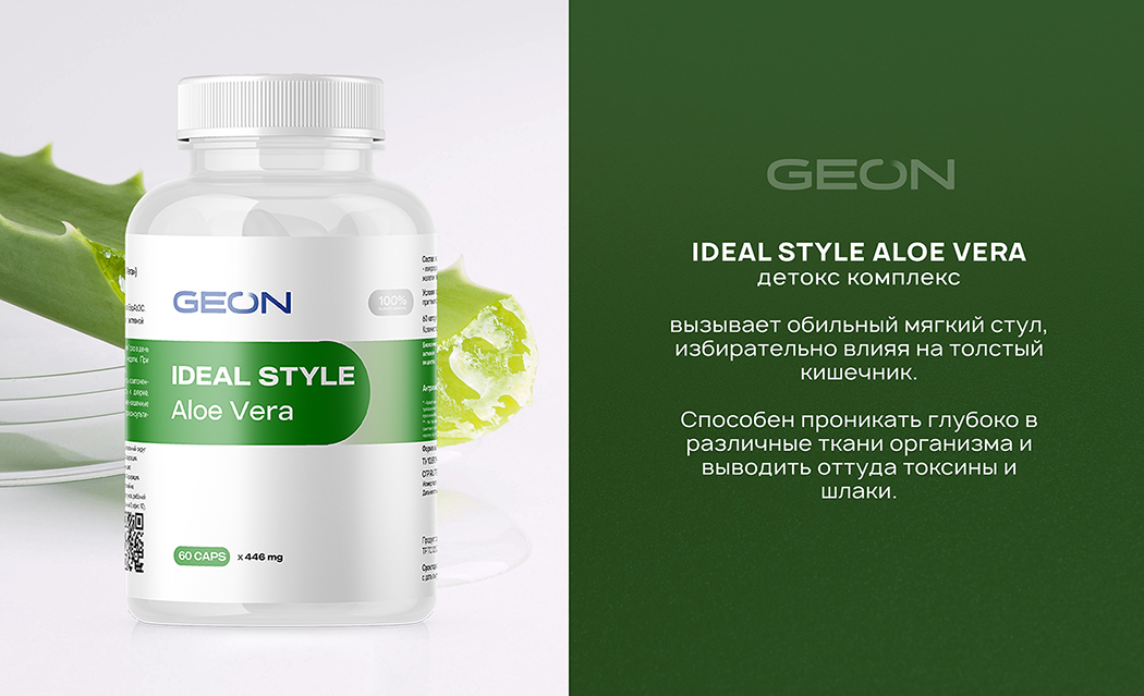 Компания GEON создала на основе алоэ вера детокс комплекс Ideal Style Aloe Vera. Прием комплекса вызывает обильный мягкий стул, избирательно влияя на толстый кишечник. (Имеются противопоказания)