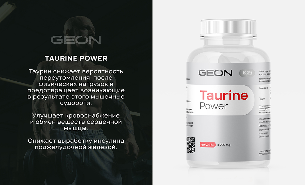Добавка Taurine Power от GEON включает 90 капсул по 700 мг, что позволяет выбрать дозировку индивидуально для себя (1400-2100 мг или больше) с учётом уровня вашей физической активности. Продукт имеет доступную стоимость и позволит улучшить качество ваших занятий.
